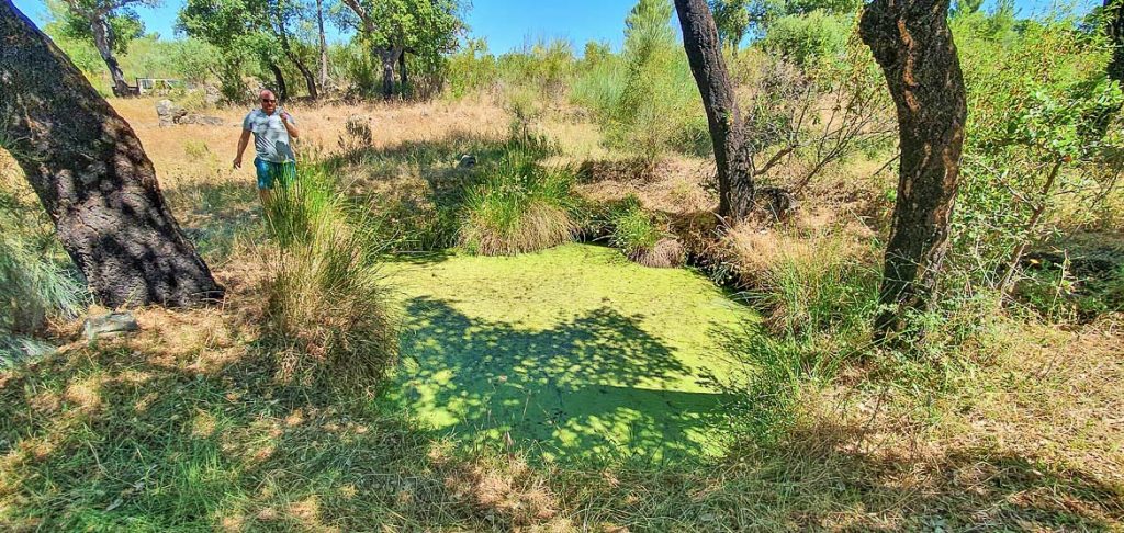 Da Wasser auf dem Grundstück in einem Land mit extremer Hitze und Feuergefahr im Sommer ein absolutes Muss ist, waren wir froh, dass wir nicht nur eine Wasserstelle auf unserem Grundstück haben. Der Teich wird noch ergänzt durch eine Quelle und mittlerweile einem zweiten Brunnen. Diesen haben wir jedoch noch nicht aktiviert. Bei der Besichtigung war das Wasser im Teich glasklar und mit Wasserlinsen. Als wir im August wiederkommen ist das Wasser gekippt und wir müssen den Teich erst mal sauber machen.