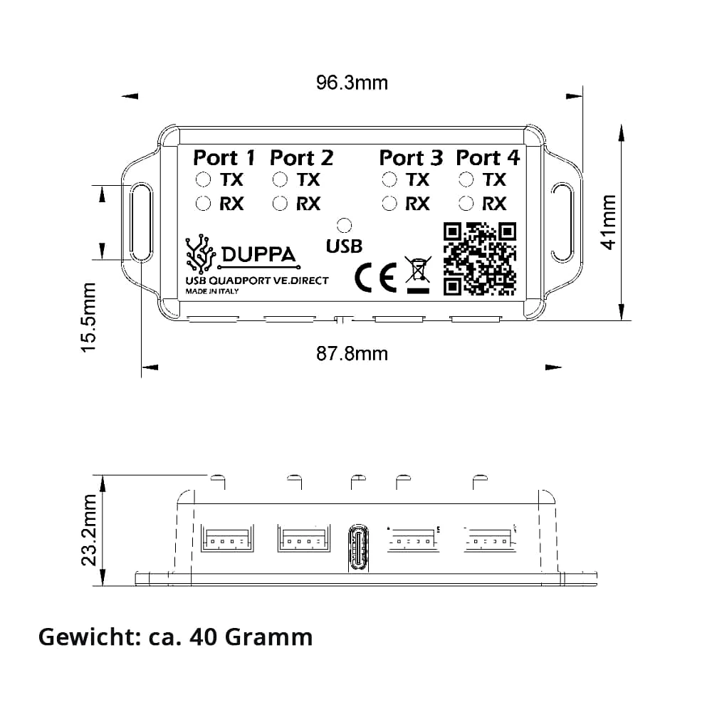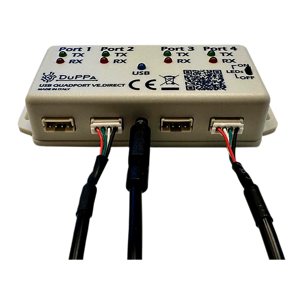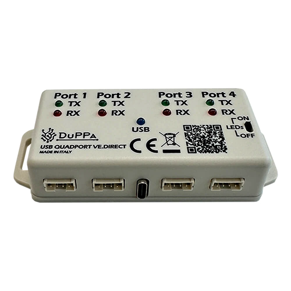 Die USB Quadport VE.Direct Schnittstellenerweiterung von Duppa bringt dir mehr Anschlüsse für deine Victron GX-Geräte. Stecke den Quadport in den USB-Port deines GX und nutze sofort vier zusätzliche, isolierte VE.Direct-Anschlüsse – schnell, sauber, Plug & Play.